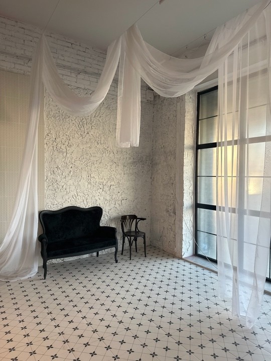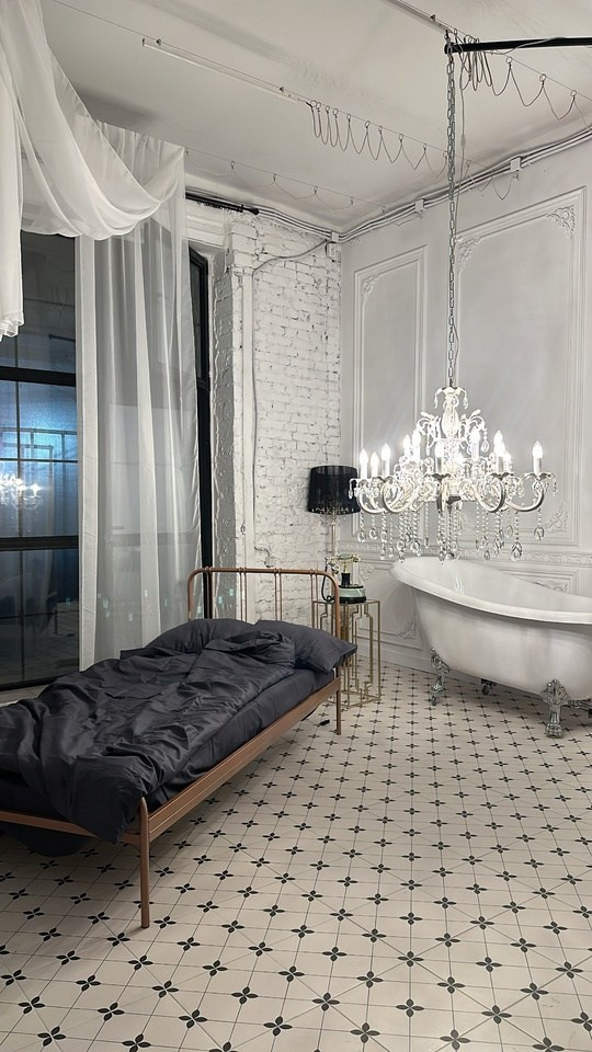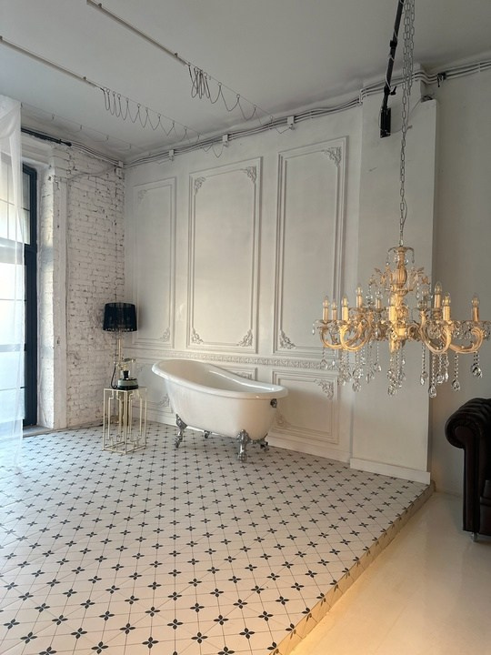 Интерьерный зал — зал с белыми стенами, большим количеством антикварного и современного интерьера и ванной.